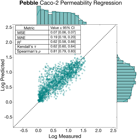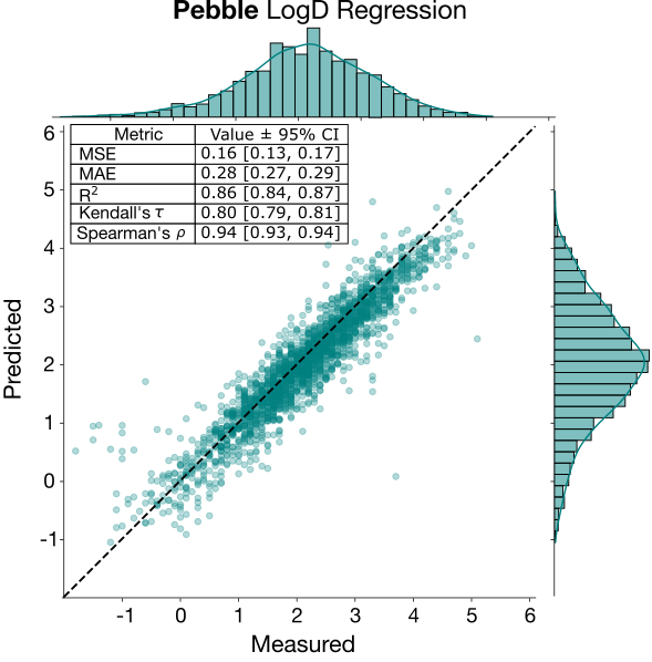 These two endpoints were the most represented in the training set, and generally have the most available public data, so one naively could expect performance to be better for these two. LogD prediction was excellent both in relative terms (RAE) and ranking (Kendall’s tau). This result was expected and reflects the abundance of external—public and proprietary—training data for this endpoint. LogD is known to be a relatively "learnable" property because it's largely additive. Contributions from molecular fragments sum predictably, and those same fragments tend to contribute similarly across different molecules. This contrasts with properties like solubility, where fragment contributions are less transferable and the overall property emerges from more complex, non-additive interactions.The excellent performance of the LogD regression model for the top performer, pebble, is shown below.