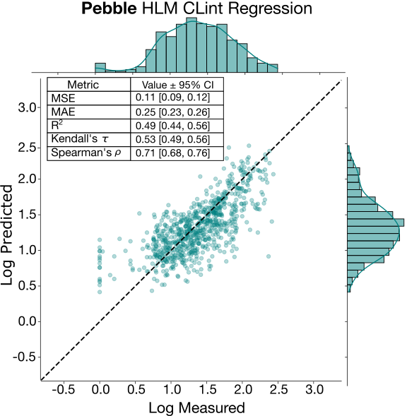 The intrinsic clearance endpoints (CLint) proved the most challenging tasks for participants, both in terms of relative error and ranking ability. Despite being well represented in the training set, and supplemented by public data (for example, in the ASAP-Polaris dataset), intrinsic clearance is notoriously difficult to predict, especially from public data [4]. This is mostly due to its sensitivity to small structural changes, making it difficult for models to generalize. The regression plot for pebble’s HLM CLint model is shown in the plot below. While the low MAE suggests good absolute performance, intermediate Kendall’s tau and R2 reveal that the test set molecules are still challenging for the model despite the test set being largely within the same chemical space. Similarly to KSOL, both MLM and HLM CLint exhibit a large dynamic range (stdev in the log scale is >0.6 for both), but with most compounds falling in the moderate to high clearance threshold. Notably, the regression plot shows that the model struggles to accurately predict low clearance molecules; these are more predominant in the test set as clearance became more “solved” towards the end of the discovery program (data not shown).