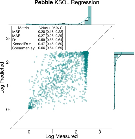 On the other hand, KSOL exhibits a decent relative performance, but poor ranking ability. While the data volume for this endpoint is comparable to that of LogD, KSOL is generally considered more challenging to predict across diverse chemical series [3]. It seems that the KSOL models were able to capture the global average solubility of the molecules, but were unable to rank the molecules prospectively. This difficulty is compounded by the highly skewed distribution of the data, with most molecules in the training and test set either falling into the “high-solubility” (median > 200µM), or “low solubility” threshold (<5 µM), leading to a large dynamic range (stdev of 0.7 in log scale). In such a “clumped” distribution, it is likely models are acting as binary classifiers (i.e., distinguishing between “soluble” vs “insoluble”), but lack the resolution to differentiate between compounds within the highly soluble cluster. Similar behaviour was observed in the recent ASAP Discovery-Polaris Antiviral competition, with KSOL proving easy to predict in relative terms, but with poor ranking performance. After examining the regression plot for KSOL below, the model performance is evidently poor, with a tendency to collapse predictions toward the distribution’s extrema rather than capturing meaningful structural-activity relationships.