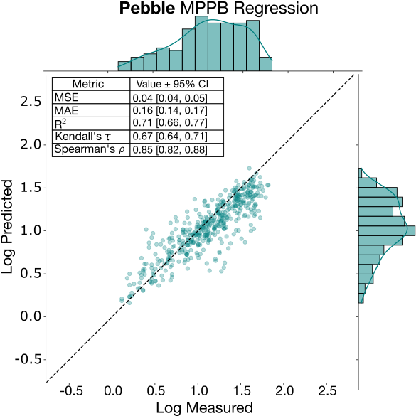 The three protein binding endpoints demonstrated robust performance across both error-based and rank-based metrics, despite being the least represented endpoints in the training and test set (and being somewhat more “niche” in the case of MBPB and MGMB). Several factors contribute to their good performance. First, while all three of these endpoints have a small dynamic range (~0.4 stdev on log scale), the data is evenly distributed across that range without the significant “clumping” observed with KSOL. The distribution can be appreciated in the MPPB regression plot below, which also shows a lack of significant outliers, leading to satisfactory correlation and error metrics.