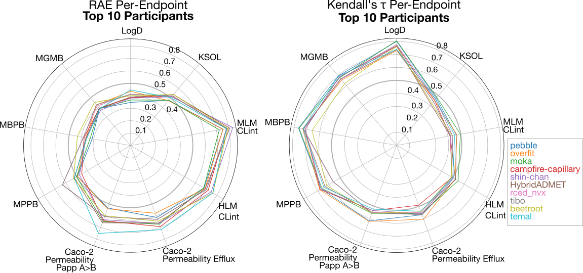 The overall performance varied significantly across the different endpoints. We show a radial plot with the distribution of RAE performance for the Top 10 participants (left). For most of the top-performing participants, LogD, KSOL and the Protein binding endpoints (MPPB, MBPB, and MGMB) seemed to be the easiest to predict in relative terms, while the clearance endpoints (MLM CLint and HLM CLint) and Caco-2 permeability endpoints consistently showed high error across the participants. Analysis of ranking ability with Kendall's tau reveals that the LogD and protein binding models had strong ranking ability, while ranking ability for KSOL, clearance and Caco-2 permeability was weaker.