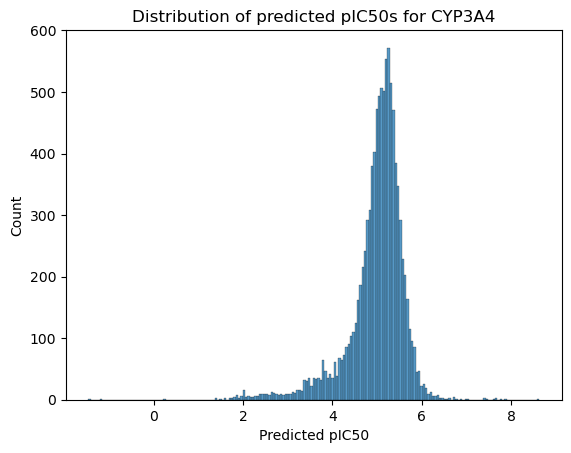 plt.title("Distribution of predicted pIC50s for CYP3A4")