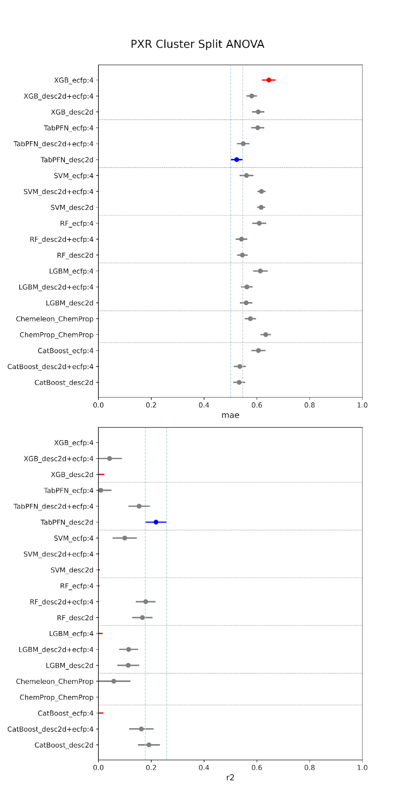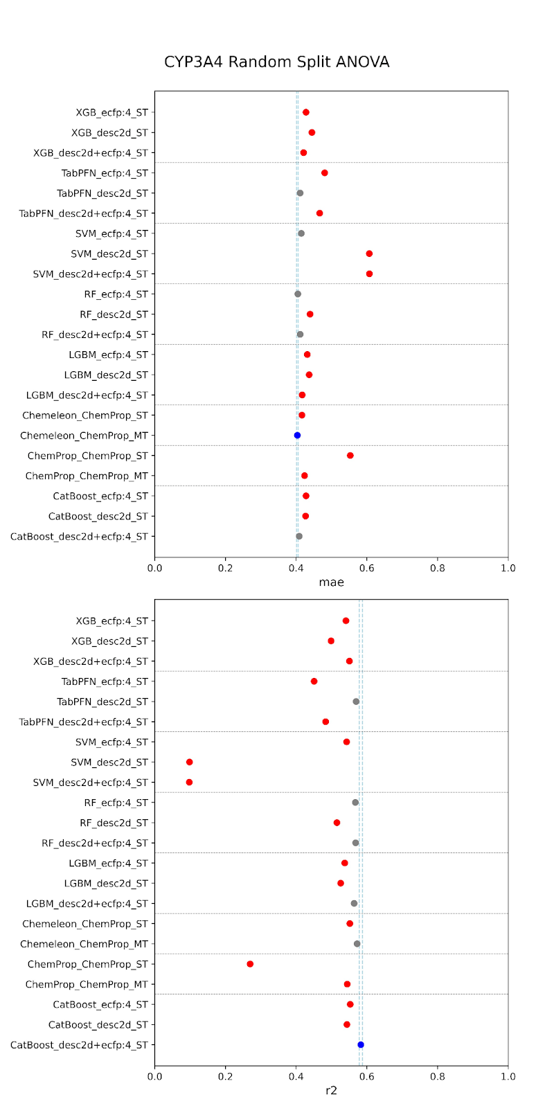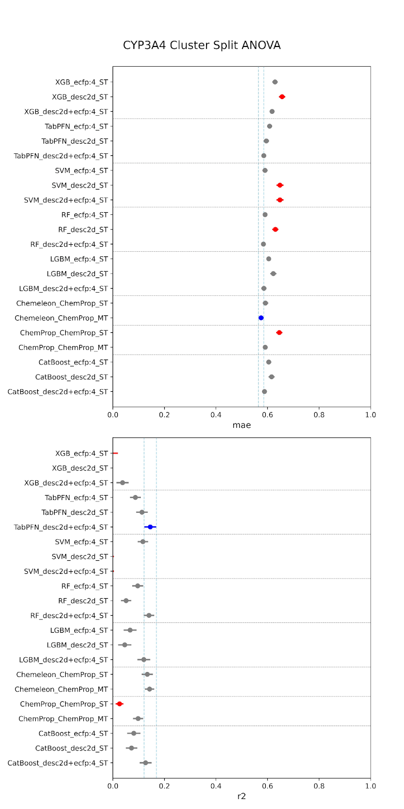 Below are our results. The models are specified along the y-axis in the form “model-featurizer” for PXR and “model-featurizer-tasks.” The featurizers are either ECFP:4 fingerprints, 2d chemical descriptors from molfeat, or ChemProp featurizers. For CYP3A4 “ST” denotes “single task” models and “MT” denotes multitask models trained on all CYP data. The best performing model is marked in blue, with statistically equivalent models to the top performer in grey, and models statistically worse than the top performer in red.