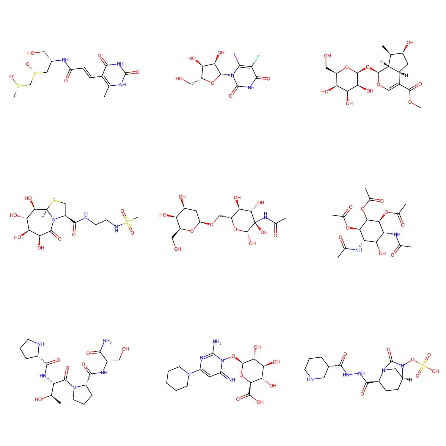 In this example, we have sampled a small subset of 10,000 compounds from the ZINC database in the file compounds_for_inference.csv that we are interested in screening. Some of the molecular structures of these compounds are shown below: